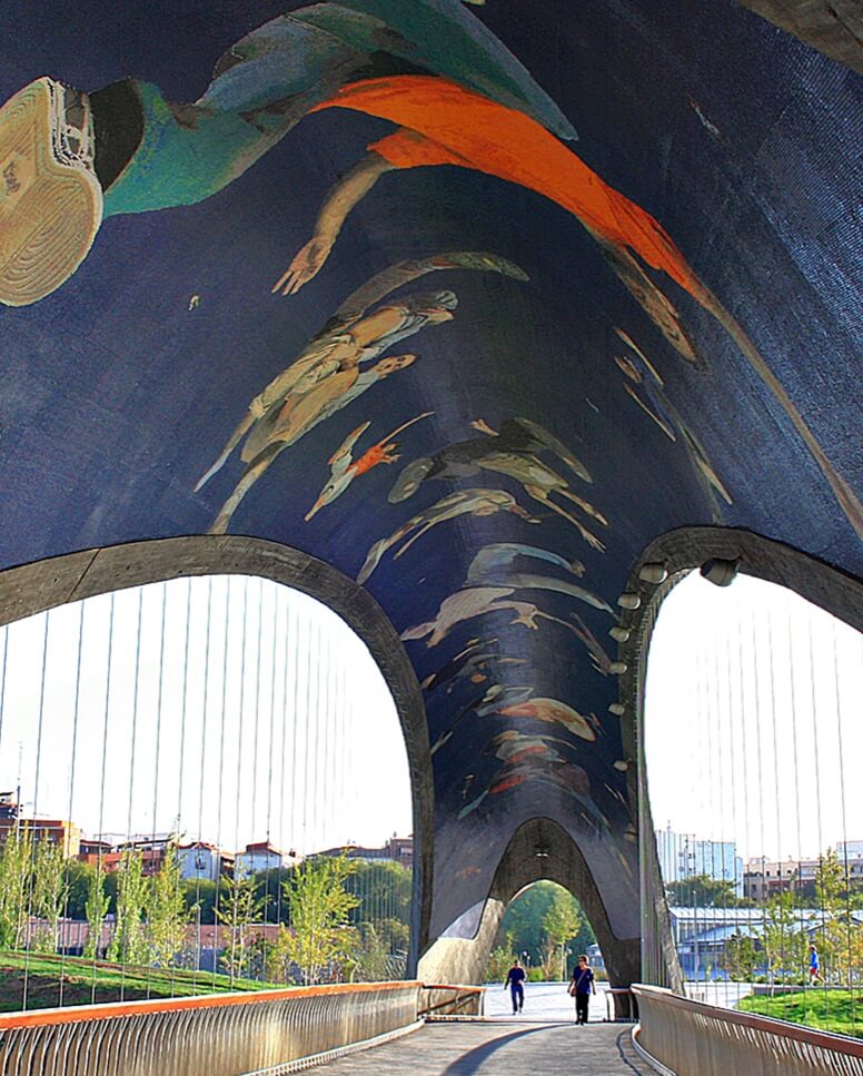 Instalación pública permanente con 6,5 millones de teselas de vidrio reciclado cubriendo los techos abovedados de los dos puentes peatonales del río Manzanares.