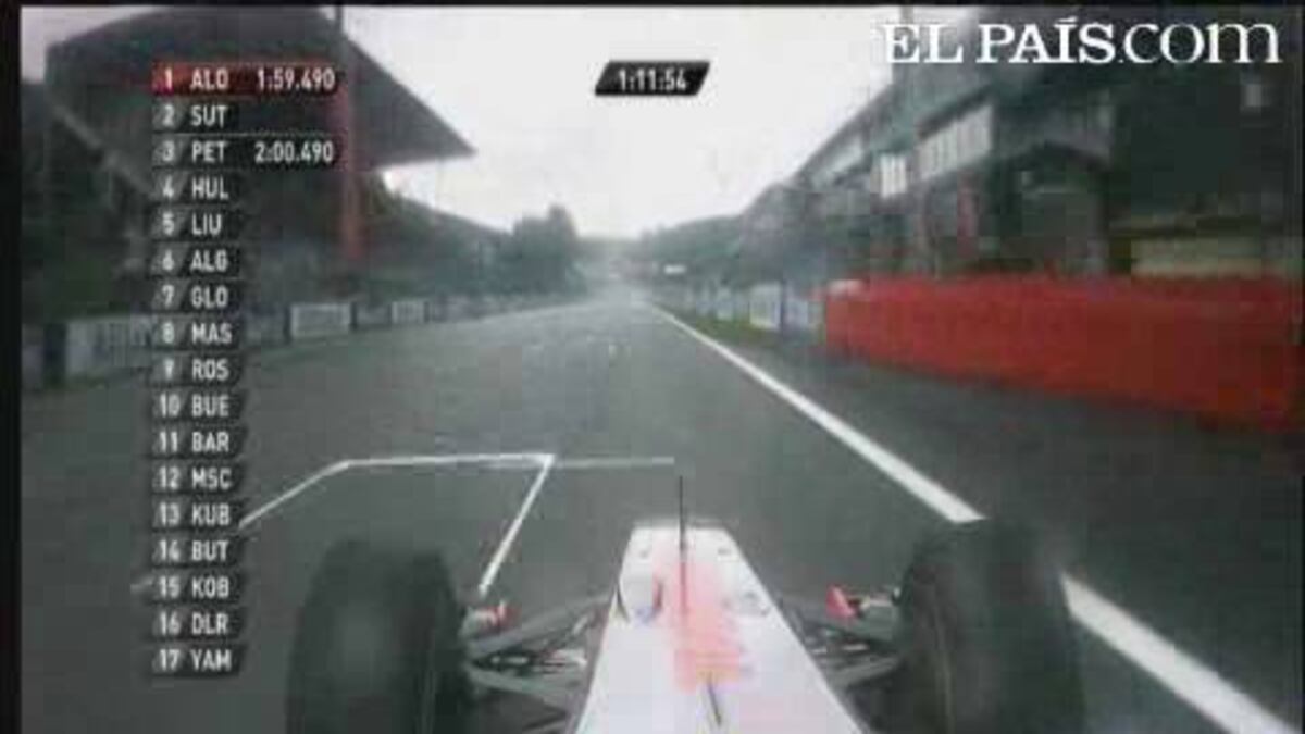 En el primer ensayo, disputado en unas condiciones extremas por el agua que ha anegado la pista, el español ha sido el más rápido (2m 0,7s), siete décimas por delante de Lewis Hamilton y un segundo más veloz que Robert Kubica. Tras apuntarse el mejor registro, el chico de Oviedo se ha puesto en contacto con su equipo para informar de que el piso comenzaba a estar impracticable y que había un par de ríos que bajaban caudalosos por la zona de Eau Rouge y de Stavelot, circunstancia que ha obligado a la mayoría de corredores a tomar el carril de los talleres para refugiarse del temporal.