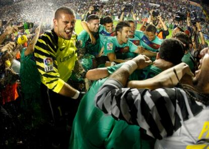 Los jugadores del Barcelona abrazados en círculo en mitad del césped, los del Levante igualmente exultantes. Guardiola tendiendo la mano a su colega Luis García. Los presidentes de ambos clubes, Sandro Rosell y Quico Catalán, fundidos en un abrazo en el palco. Los aficionados, todos, celebrándolo a lo grande, unos el título, los otros la permanencia, una gesta para los del Barcelona, y un éxito no menos meritorio para los del Levante. El empate contentó por igual a unos y otros.
