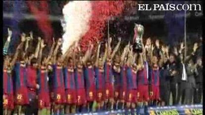 Xavi y Puyol recibieron sobre el campo el trofeo de manos del presidente de la federación y en presencia de Rosell, pero no la alzaron hasta que volvieron al centro del campo, donde les esperaban los 24 futbolistas que han participado este curso en la consecución del título. Explotaron entonces los tradicionales cañones de confeti y el campo se volvió aún más azulgrana mientras sonaba el himno del Barça. Los jugadores iniciaron la vuelta de honor al estadio, acompañados de los acordes del We are the champions, de Queen, bajo una espectacular lluvia de papelitos dorados, mientras a su paso lanzaban pimientos a los aficionados, que sacaban de decenas de cajas estratégicamente repartidos por el campo. "Tenir un parell de pebrots" para los catalanes equivale a tener un par de huevos.