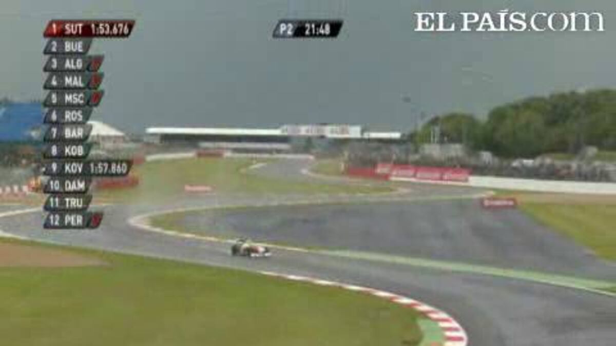 La tabla de tiempos de la primera jornada de ensayos del Gran Premio de Gran Bretaña de fórmula 1 experimentó más movimiento en los últimos cuatro minutos de la segunda sesión que en las casi tres horas anteriores. Finalmente fue Felipe Massa el que apuró más su última vuelta y colocó su Ferrari al frente, por más que Mark Webber, en la primera manga, rodara más rápido que él debido al mejor estado del asfalto, que se ha ido anegando con el paso de las horas. Nico Rosberg ha sido el segundo más veloz por la tarde, justo por delante de Kamui Kobayashi y de Lewis Hamilton, mientras que Fernando Alonso solo ha completado seis vueltas, se ha clasificado el 15º, y, como la mayoría, se ha pasado la mayor parte del entrenamiento metido en el taller.