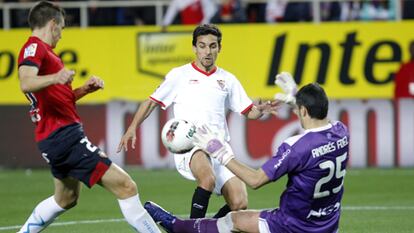 Míchel se estrenaba en casa y se encomendó, a Palop y Kanouté, los últimos guardianes de la esencia gloriosa del Sevilla, y dibujó un equipo valiente, con dos delanteros, dos hombres de banda y solo un centrocampista de corte defensivo, Medel. Osasuna respondió con una aglomeración de jugadores en la medular vacía carácter y echando en falta a Raúl García.