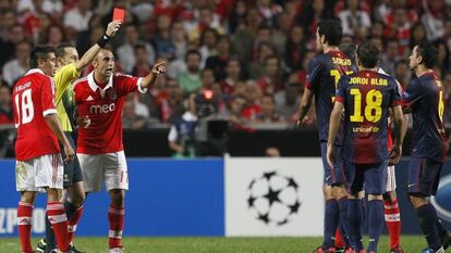 El colegiado turco Cüneyt Çakir mostró una roja directa al medio azulgrana por entender que intentó agredir a un rival a los 87 minutos del choque en el estadio Da Luz de Lisboa, que se saldó con la victoria del Barça (0-2).