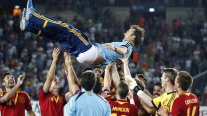 Con dos goles de ventaja, España no encontró tampoco esas circulaciones mareantes que la emparentan con la mejor tradición brasileña de matar los partidos al paso, al toque y con acelerones. Admitió la ida y la vuelta en la segunda parte y también salió ganadora. Montoya arrancó el segundo penalti tras un recorte de tacón que se tragó Regini. No lo lanzó Thiago, que se lo dejó a Isco para que se refrendara como mejor jugador del torneo. Otro gesto sobrio y colectivo de Thiago para rematar una aparición oportuna acorde con ese número 10 y el brazalete de capitán con el que recogió el trofeo como emblema de un estilo hegemónico que se perpetúa al toque.