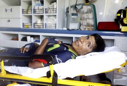 La alegría le duró 20 kilómetros. Aún sin llegar a sudar, le llegó la montonera. Algo pasó y muchos se fueron de bruces al asfalto, entre ellos Nairo, el dolorido, el ecce homo (no el de Borja, el de la realidad). Y al terraplén que se fue. Allí sentado, Nairo sonrió. Hay veces en los que la mueca del dolor se confunde con la del remordimiento. Y llegó la ambulancia con sus luces y su aparato para llevarse a Nairo a la Clínica Universitaria, allí muy cerquita de su casa en España junto a Pamplona, para que le hicieran una analítica completa. Conclusión: "Fractura desplazada de escápula, un hueso entre el húmero y la clavícula". El ecce homo (el de verdad, no el de Borja) ya no podía más. Y era cierto que no podía: mañana jueves será operado en Pamplona porque las heroicidades en el ciclismo tienen sus límites. Al final, son hombres con sus fuerzas, sus guiños y sus circunstancias.