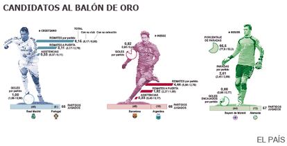 El portugués, de 29 años, ya ganó el Balón de Oro en 2008, y el pasado año, cuando levantó por segunda vez el trofeo, acabó con la hegemonía de Messi. Favorito según las casas de apuestas, ha anotado 55 goles en los 4.589 minutos que ha jugado, además de dar 18 asistencias, este 2014. Esta temporada está batiendo récords. Aunque no marcó en Málaga el pasado fin de semana, hasta entonces había anotado 20 goles en 12 jornadas.