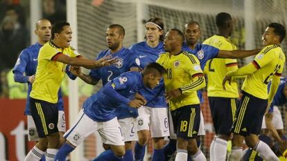 Brasil se desquició y Neymar cargó sin motivo con una tarjeta que le impedirá jugar el partido contra Venezuela. Ospina le sacó un remate de cabeza a bocajarro después de una gran jugada y un centro excelente de Alves y el delantero acabó amonestado por el árbitro Osses. No hubo intencionalidad en la mano posterior de Neymar. Hasta el descanso no hubo más noticia de Brasil, reducido por la agresividad colombiana, ejemplarizada en el excelente partido de Sánchez y los movimientos de Teo. A ningún aficionado le sorprendió el marcador por el esfuerzo de Colombia y la racanería de Brasil.
