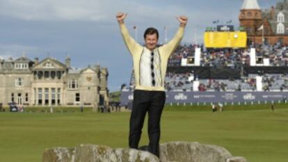 Nick Faldo (Inglaterra; 57 años) dijo adiós al Old Course, escenario en el que venció en 1990 [también ganó el Open en 1989 y 1996]. Por eso, atento y romántico, en el hoyo 18 sacó de la bolsa un jersey amarillo con rombos... el mismo que utilizó cuando gobernó los links de Saint Andrews. La multitud le vitoreó durante unos minutos, tiempo en el que saludaba, reía, se hacía fotos con su caddie y hasta con los compañeros de partida (Justin Rose y Rickie Fowler). Después, embocó el putt y acabó con -1 la jornada, +10 en total.