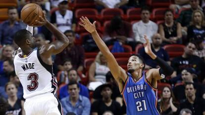 Dwyane Wade le dio la victoria a Miami en su duelo con Oklahoma (97-95). El partido fue muy igualado y se produjeron 38 cambios de líder en el marcador y 11 empates. Un triple de Kevin Durant puso por delante a Oklahoma a falta de un minuto y medio (93-95). “Fue como si estuviéramos jugando un partido de ‘playoffs’. Fue nuestro mejor partido esta temporada”, afirmó Dwyane Wade, el jugador decisivo.