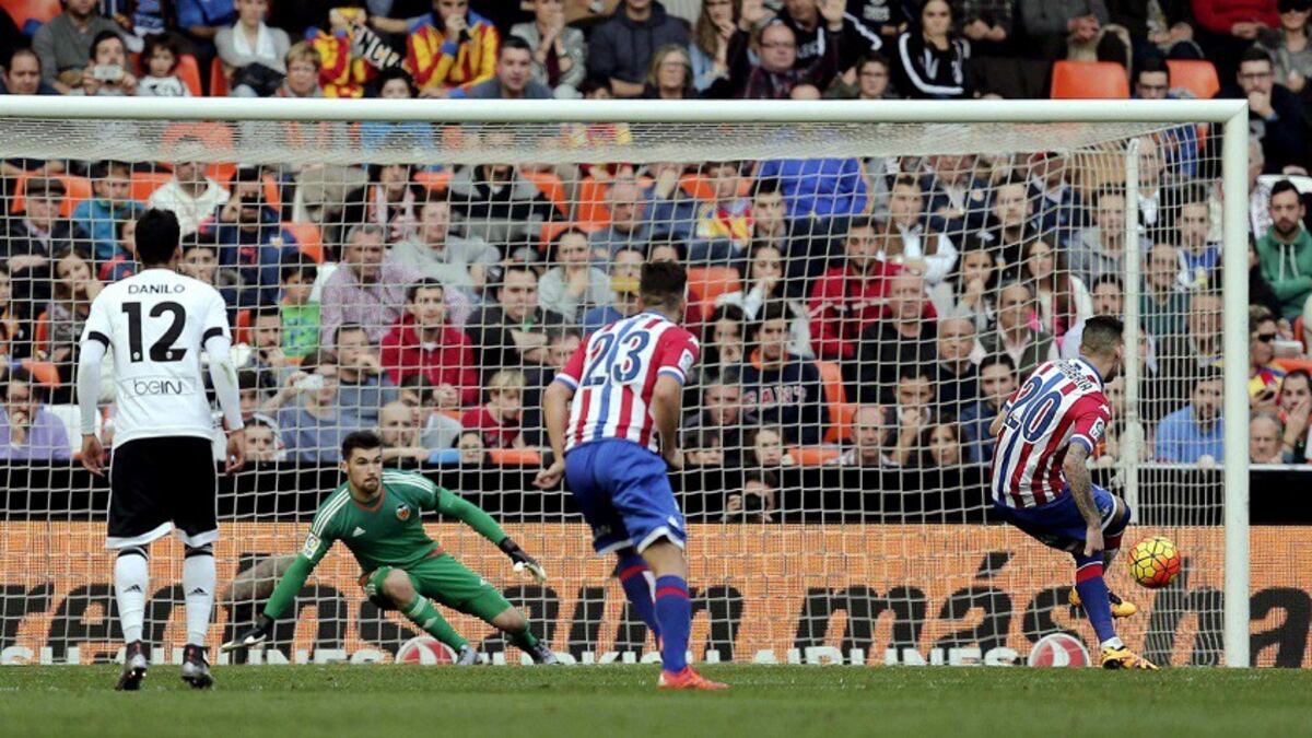 El inició del partido desmintió el desenlace final. El Valencia se propuso no dar opciones al Sporting, sometido a la intensidad del conjunto che comprometido, superior en todas las facetas del juego al equipo asturiano, con el recuperado Feghouli tras dos meses de ausencia por lesión y Piatti percutiendo por las bandas. Cuestionado su rendimiento hasta la fecha, pretendido por varios equipos en el mercado invernal, el extremo argentino, activo durante el primer acto sustituido al poco de comenzar el segundo, tuvo la ocasión al cuarto de hora de poner en ventaja al Valencia tras un disparo interceptado por Cuéllar tras una acción de André Gomes. Anteriormente la gozó Negredo asistido también por el portugués. Al delantero vallecano, de nuevo capitán, le sigue faltando chispa y velocidad para dar lustre a sus buenos movimientos y alcanzar los remates.