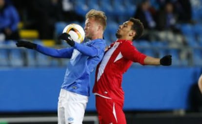 El Molde, todo pasión, siempre quiso más que el Sevilla, que solo suspiró porque fueran pasando los minutos y llegara el final del encuentro para pensar solo en el duelo ante el Barcelona de Liga. Los noruegos dominaron casi siempre, tan impetuosos como imprecisos. Fue el Sevilla, jugando andando, el que gozó de las primeras ocasiones de peligro. En especial, un disparo impresionante de Banega que dio en el larguero tras una preciosa dejada de Konoplyanka. Cuando parecía que dominaba más el Sevilla, un error de Fazio en el despeje propició el gol de Eirik Hestad a los 43 minutos. Tremendo lo del argentino, que llegó en el mercado invernal para reforzar al Sevilla tras un largo periodo de inactividad y acumula un error tras otro cuando juega.