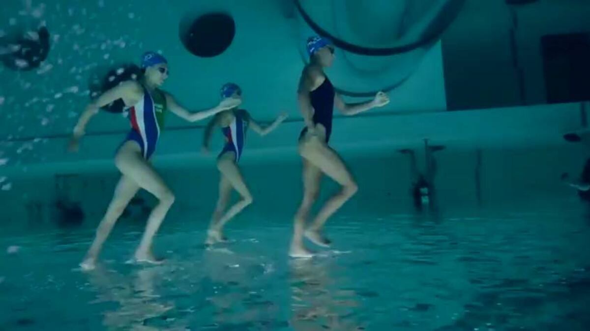 Una cámara sumergida en el agua y del revés muestra los movimientos de las nadadoras como si no hubiera agua
