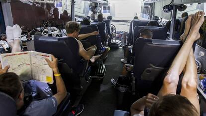 Cuando los corredores cruzan la línea de meta, lo primero que se encuentran es un asistente de su equipo que les reparte bebidas frescas camino al autobús, donde toman unos batidos de recuperación y donde suele haber montados unos rodillos para, tras un gran esfuerzo, relajar la musculatura con un rodar suave mientras comentan cómo ha ido el día. En el nuevo motorhome que acompaña al Etixx-Quick Step, los ciclistas disponen de duchas y bañeras de agua fría. "En carreras como la Vuelta a España, que hace mucho calor, viene muy bien tener este tipo de comodidades. Vamos de puta madre", dice con una sonrisa De la Cruz.