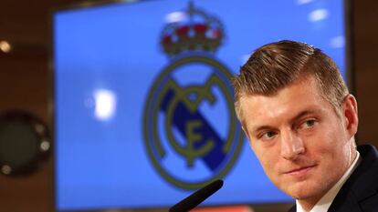 Estaba citado a las 13.30 y a las 13.30 en punto apareció Toni Kroos por la sala de prensa del Bernabéu. La gomina en su sitio, el peinado de siempre, tan perfecto que parece esculpido, un traje azul oscuro, corbata del mismo color, camisa blanca y zapatos marrones. En el día de su renovación (amplió hasta 2022 el contrato que tenía firmado hasta 2020) el centrocampista del Real Madrid saludó en castellano, pero dijo que iba a hablar en alemán.