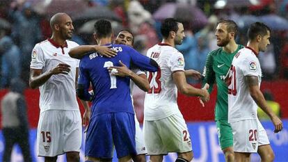El Sevilla jugó con tres centrales, pero triunfó en muchas fases del partido en su intención de quitarle el balón al Atlético. Huérfano del esférico, a los de Simeone se le atragantaba tanta presencia de jugadores que necesitan el contacto continuo con el balón, caso de Correa, Koke o Carrasco. El Sevilla llegó incluso a arriesgar sobremanera cediendo la pelota a su portero, pero ya se sabe que Sampaoli es así. Morirá con su idea de ganar la posesión, aunque en extrañas ocasiones su buen dominio se tradujo en ocasiones de gol. Esencialmente, porque resulta muy complicado hacerle daño a un sistema defensivo lleno de automatismos y contundencia, guiado por un Gabi omnipotente en la presión al rival. El Sevilla nunca le perdió la cara al encuentro, pero le costó hacer daño en la primera mitad.