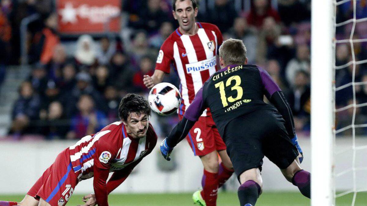 Quiso saber Simeone desde la necesidad hasta qué punto era cierta la vulnerabilidad del Barcelona, un equipo inseguro, permeable en la divisoria, incapaz de transmitir autoridad y confianza a los rivales y a su propia hinchada, incluso después de su victoria en Madrid. Abierto a las bandas por Gaitán y Carrasco, el Atlético enfiló de salida al Barça con Torres y Griezmann. A partir de cuatro zagueros y prácticamente seis atacantes, los rojiblancos funcionaban igual de bien en la presión que en las transiciones, como se advirtió en un mano a mano de Carrasco con Cillessen, bien resuelto por el meta del Barcelona.