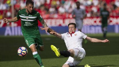 Espeso, sin desborde ni velocidad, el Sevilla fue un lamento, bien sujetado por el Leganés, ordenado y agresivo. La desesperación empezaba a apoderarse de los andaluces cuando en una ráfaga, en un destello de ese fútbol que les tiene tan arriba, Vázquez se inventó una pared fabulosa para que Jovetic marcara el empate poco antes del descanso. Fue una delicia de toque para desmontar la zaga madrileña, segura hasta entonces, perdida en la alocada salida de Mantovani en una acción bien aprovechada por Jovetic.