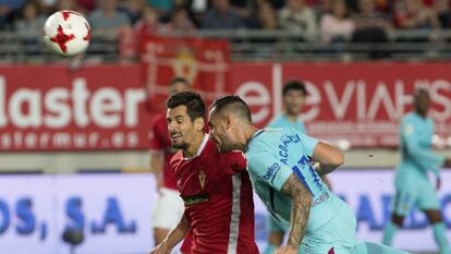 Los muchachos de Salmerón defendían con rigor y sus salidas eran selectivas e interesantes porque siempre acababan la jugada, la mejor manera de no permitir el despliegue del Barcelona. Tuvo un par de disparos francos y una ocasión excelente de Llorente. El Murcia se animó y planteó un encuentro más abierto y divertido para suerte de la hinchada de la Nueva Condomina. Y, en un contexto de igualdad, esponjado el campo, apareció Deulofeu y puso un centro que Alcácer cabeceó impecablemente a la red de Santomé. El ariete apenas se levantó del suelo, estiró el cuello y cruzó el balón al costado de Santomé.