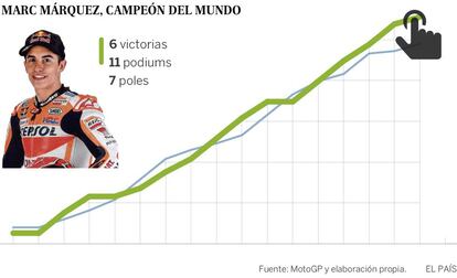 Con este título, Marc Márquez, que ya fue el piloto más precoz y el más joven en ganar un campeonato de la categoría reina –lo logró en el año de su debut y a los 20 años, superando así a Freddie Spencer– rompe otros récords de precocidad. Lo lleva haciendo desde que ganó su primer título de 125cc, con 17 años en 2010, cuando sumó diez victorias, solo una menos de las que había logrado Valentino Rossi. Este curso sus registros son también maravillosos: ha alcanzado los 100 podios (lo hizo en el gran premio de Japón) y los ha logrado un año antes de lo que lo hizo el italiano, considerado el mejor piloto de la historia y hasta entonces el más joven en alcanzar la cifra centenaria.