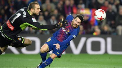 El Espanyol se marchó tan conforme como llegó al campo del Barça. Quique Sánchez Flores quedó tan contento con el partido de Cornellà que repitió el plan en el Camp Nou. Apostó por un solo delantero, Gerard Moreno, y llenó el centro del campo con cinco futbolistas para negar el juego interior del Barça. Acaso sorprendió que en la portería jugara Pau López después de que Diego López fuera decisivo en la ida al pararle un penalti a Messi. Al 10 le animaba el afán de revancha en un equipo azulgrana muy titular, ya con Iniesta y rematado con un tercer delantero, Aleix Vidal, señal de que el Barça iba desde la alineación a por el partido y a por la eliminatoria, consciente de que necesitaba remontar un 1-0.