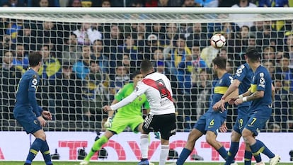 Ponzio nunca pudo pegar las líneas de River. Situación que condicionó a los centrales, sobre todo a Maidana. El zaguero, único futbolista que levantó la Libertadores con Boca (2007) y River (2015), nunca estuvo a gusto en el Bernabéu. Le generó el primer susto de la final a Armani con un mal despeje, mal ubicado en el gol de Benedetto, siempre dubitativo en los centros cruzados de Pavón y Villa. Reaccionó Biscay, que reemplazó a Ponzio por el tan intermitente como desequilibrante Quintero. El colombiano enchufó al cuadro de la banda, junto con Palacios, también clave en la reacción de River. Si el plan A con una nueva variante táctica de Gallardo, con el 4-5-1, no le funcionó, sí lo hizo el plan B.