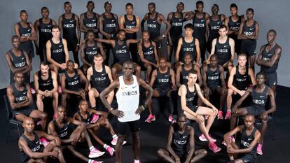 A Kipchoge le marcarán el ritmo 41 liebres que, en cinco equipos de siete, más seis reservas, y con él, 42, los kilómetros del maratón, marcharán en V, como una flecha inversa a la marcha que se comerán toda la resistencia aerodinámica y le trasladarán el rebufo del vehículo cercano que abrirá paso con un cronómetro gigante. Detrás de la K de Kipchoge, en los gráficos figuran dos atletas más, que, según mandan los ensayos matemáticos, le robarán cualquier turbulencia. Entre las liebres, coordinadas y disciplinadas por su capitán, Bernard Lagat, un veterano de Monza, están algunos de los mejores atletas de la actualidad, como los tres hermanos noruegos Ingebrigtsen, el etíope Salemon Barega, el campeón olímpico de 1.500m Matthew Centrowitz, Paul Chelimo, Augustine Choge, López Lomong… Se relevarán cada cinco kilómetros, con lo que romperán una norma fundamental, la de que todos los que participen en la carrera deben intentar terminarla, y no pueden entrar y salir de ella a voluntad. El trabajo de las liebres (41 atletas de altísimo nivel, los mejores del mundo en 1.500m y 5.000m) y el rebufo del coche que abrirá carrera supondrán 1m 40s más de beneficio.