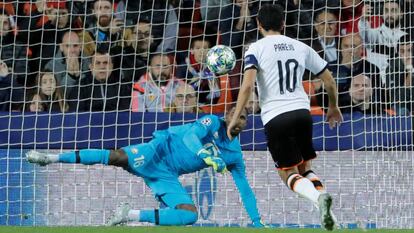 El planteamiento decidido del Lille cobró pronto un tanto. La presión de André sobre Parejo provocó una pérdida del capitán cuando intentaba cambiar de orientación el balón. La pelota, rebotada en la bota del mediocentro francés, salió, envenenada, hacia atrás. Como un gamo Osimhen atacó el espacio, capturó el balón y se metió imparable entre los centrales del Valencia, muy abiertos. El potente sprint del nigeriano lo llevó ante Cillessen, al que batió con facilidad.