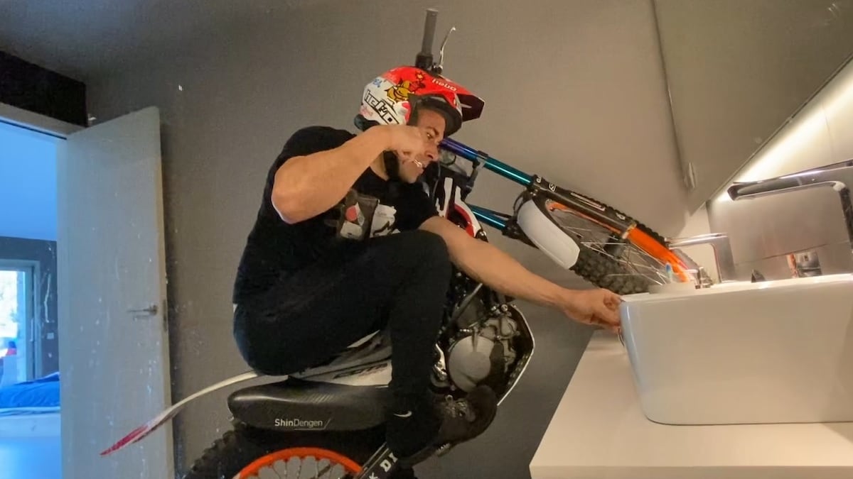 El campeón del mundo de trial aprovecha el confinamiento para entrenarse en casa de una forma diferente: hasta se lava los dientes montado en su Honda
