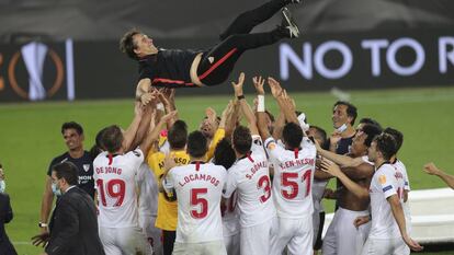 El entrenador, que lo había dirigido unos meses el año anterior en su brevísima etapa como preparador del Real Madrid, fue otro de los miembros del Sevilla a los que se vio este viernes en Colonia (Alemania) con los ojos vidriosos. Para él ha sido difícil el camino hasta su primer título como técnico de un club —antes había conseguido el Europeo sub-19 y el sub-21 con España—, logrado en un equipo al que llegó tras ser despedido del Bernabéu solo unos meses después de su salida turbulenta de la selección española a las puertas del Mundial de Rusia. Como Navas, el técnico se acordó de los que no están: de las víctimas de la pandemia y de los dos canteranos ilustres fallecidos, José Antonio Reyes –en un accidente de tráfico el año pasado– y Antonio Puerta –murió en 2007 tres días después de sufrir una parada cardiorrespiratoria en un encuentro ante el Getafe–, a los que el Sevilla dedicó la celebración con una camiseta serigrafiada con sus fotos: “Estamos aquí a 22 de agosto y ha sido complejo. Para mí es una alegría inmensa. Pido a los aficionados que sean prudentes en la celebración [debido al coronavirus], pero que lo celebren. Esto va por ellos, por Reyes y por Puerta”.