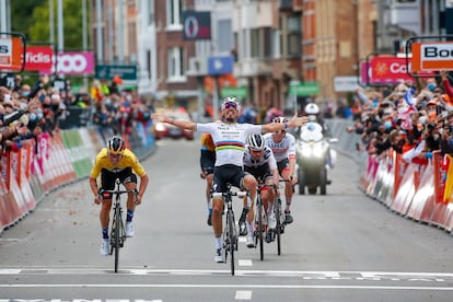 A Hirschi, incansable aún cuatro días después de ganar la Flecha, no le importó reducir más el grupo con un ataque en la dura cuesta de Boncelles, a 10 kilómetros de la meta; a los demás, Pogacar, Roglic, no les importó seguir colaborando a cuatro para evitar que enlazara el grupo que les perseguía, con Van der Poel al frente. Los cuatro, todos ellos muy rápidos, ninguno de ellos cojo en asuntos de velocidad, pensaban que podían ganar al sprint. Y los mismos protagonistas de septiembre en el Tour y en el Mundial, al sprint se la jugaron. Hasta aquí, un asunto de normalidad. Pero no lo que ocurrió en el muelle de las Ardenas, en la última recta. Por allí, mientras los cuatro se vigilaban, se amagaban, aparece repentino, como el rayo, Mohoric, un tercer esloveno en discordia. Alaphilippe, vigilante, toma la cabeza y controla volviendo la cabeza. Espera que llegue Mohoric. Intuye que va a intentar pasarles lanzado y quiere aprovechar su velocidad para arrancar su sprint. Así lo hace el francés, que a 150 metros de la llegada sale de la espalda de Mohoric al centro de la calle, con Hirschi y Pogacar pegados a su rueda; que a 100 metros, cuando el suizo está para saltar de su rueda, se mueve con brusquedad de las vallas al centro y hace perder la pedalada a Hirschi y también a Pogacar, desconsolados; que a 50 metros ya se siente ganador, a 25 se yergue vertical sobre la bici y empieza a levantar los brazos. Y todos piensan en Argentin, en Merckx, en Van Looy, en Kubler, en los que ganaron la decana de arcoíris, pero a unos centímetros el campeón del mundo ve a su derecha la sombra de un bólido amarillo, Roglic dando un golpe de riñones, que le sobrepasa sobre la línea. Y se le caen los brazos, y el alma. Y todos acordaron de la San Remo de 2004, de Zabel erguido creyéndose ganador, de Freire adelantando su rueda para ganar la primera de sus tres classicissimas.