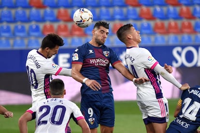 Hay partidos marcados en el calendario desde julio. Donde no se deben tolerar los regalos. Un Huesca-Valladolid, salvo temporadas excepcionales, es uno de esos exámenes cuyo resultado ambos equipos mirarán, con alegría o tristeza, cuando lleguen las notas de fin de curso. Ambos salieron este domingo al Alcoraz bajo una clara consigna. Los locales, a proponer juego y a llevar la iniciativa. Los visitantes, que arribaron a Aragón como colistas, en busca de la eficacia que les ha dado dos permanencias en dos años y que esta campaña no aparece. Los oscenses comenzaron con ganas, rondando el área rival pero sin el acierto que permite respirar en julio. Los de Sergio, sobre el que se han cernido dudas estas semanas sin victorias blanquivioleta, aguantaron ese ánimo inicial y se adelantaron sin grandes méritos para ello. Una jugada de estrategia en la que Bruno cabeceó a gol un buen envío al segundo palo tras un córner pucelano congeló los buenos minutos del Huesca. Roberto repelió sendos cabezazos de Rafa Mir, uno de ellos con un paradón que despejó también las incógnitas sembradas en la previa sobre si Masip recuperaría su puesto tras superar el coronavirus.