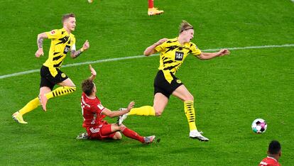 Erling Haaland lo ve todo antes que los demás. Ve espacios en la maraña, ve el punto débil en la roca, ve al defensa que vacila, al marcador que cambia el peso de pie, la cintura que gira, la jugada que se abre, el pase del amigo antes de que el amigo vea el pase. Este sábado en el clásico de la Bundesliga vio todo antes que todos. Compañeros y adversarios. También vio la indecisión entre Kimmich y Boateng, según rodaba la pelota tras un saque de banda del Bayern hacia el mediocampo. Despegó como un halcón, se llevó la pelota, y cuando Kimmich fue a ajustarle las cuentas se le escabulló. Si hubiera tenido un cómplice igual de lúcido, el ataque habría acabado en gol. Pero Reina se dejó encerrar y el dos contra dos se esfumó. La jugada ya estaba cerrada cuando el árbitro reparó en Kimmich. El mediocampista estaba tendido en la hierba, llorando, cogiéndose la rodilla derecha como si tuviera la certeza de que le aguarda una larga temporada fuera de la competición.