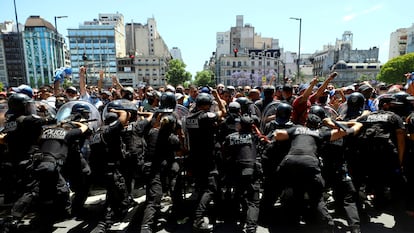 El operativo para la despedida a Diego Maradona en la Casa Rosada se ha salido de control. El Gobierno intentó cerrar el acceso a la fila de ingreso, anticipando el deseo de la familia de que el velatorio termine a las 16.00 horas de Buenos Aires (las 20.00 horas peninsular española). Las decenas de miles de personas que quedaron fuera, agrupadas a lo largo de más de 20 calles, se enfrentaron enseguida con la policía, que ha respondido con gases lacrimógenos. Quienes ya estaban en la fila, delimitada por vallas de metal, han comenzado a correr hacia la Plaza de Mayo. El descontrol ha sido total. La intención oficial era que el velatorio durase incluso hasta el sábado, pero la familia de Maradona se ha negado. Sobre el mediodía del jueves, el Gobierno anunció que se iba a extender por tres horas más, pero luego se dio por terminado en medio de fuertes incidentes. El cortejo fúnebre llegó al cementerio de Bella Vista, en la provincia de Buenos Aires, cerca de las 19.00 de Argentina (23.00 hora peninsular de España y 16.00 México). Familiares y amigos de Maradona lo han despedido en una ceremonia privada.