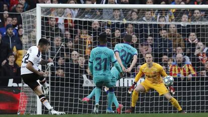 El Valencia consumido de Arabia y Mallorca se encendió con el fuego de Mestalla. Invicto en su feudo, fue puro veneno en oposición al inofensivo y vulnerable Barcelona, que ya ha concedido 18 puntos en sus salidas, sin pegada ni más delantero que su capitán, huérfano del goleador Luis Suárez. No tiene gol ni un solo futbolista con punch, inanimado y monótono, petrificado como un futbolín por más que el técnico no pare de entrenar en la ciudad deportiva Joan Gamper. No despierta de su nana el Barça, un equipo mal hecho, víctima de sus deficiencias estructurales, dependiente de Messi. Y el 10 no marcó después de rematar más que nunca, hasta 11 veces, como ante el Deportivo en diciembre de 2017.