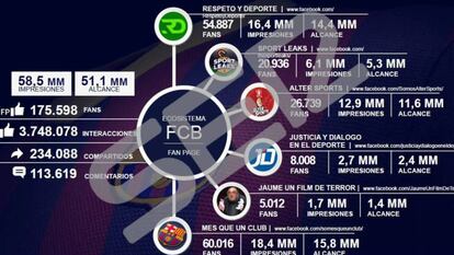 Sin embargo, el informe, publicado por la cadena Ser y desvelado en exclusiva este lunes por la noche en el programa de radio El larguero, especifica cómo trabajan con cada una de esas seis páginas de Facebook, a saber: Més que un club, la única dedicada a ofrecer contenido benévolo para favorecer la imagen del Barça y su actual junta directiva; y otras cinco, más agresivas: Alter Sports, Sport Leaks, Justicia y diálogo en el deporte, Respeto y deporte, y Jaume, un filme de terror, volcada exclusivamente en agitar a la opinión pública en torno a la figura del empresario Jaume Roures. Todas estas cuentas son de Facebook, tienen una estética muy similar y fueron creadas entre enero de 2014 y septiembre de 2015.