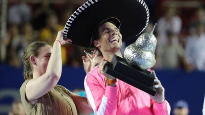 Posaba Rafael Nadal feliz, de nuevo con un sombrero de mariachi y mordiendo el Guaje de Plata, el trofeo en forma de pera que le acredita como vencedor de la última edición del torneo de Acapulco. Suma tres ya el balear, campeón en 2005, cuando todavía era casi un niño, y después en 2013, la última vez que se disputó sobre tierra batida. Ahora, siendo un treintañero en toda regla, casado y con una colección abrumadora de éxitos –85 premios individuales, 101 en total y 19 grandes–, festeja por tercera ocasión en México, un lugar que le aporta buenas vibraciones y donde este domingo (6-3 y 6-2 a Taylor Fritz, en 1h 14m) cerró una semana perfecta desde el plano competitivo.