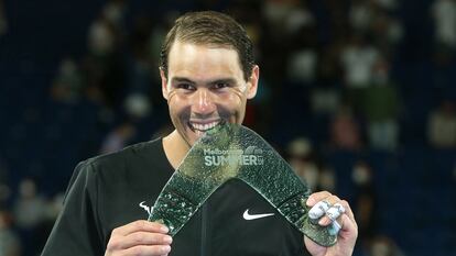 Necesitado de alegrías, de buenos estímulos y de un empujón anímico para invertir la tendencia negativa de los últimos tiempos, Rafael Nadal logró un título vitamínico en Melbourne a las puertas del Open de Australia, que comenzará el día 17 empañado por el caso Djokovic. El litigio entre el serbio y el país oceánico ha desviado el foco estos días de las pistas, mientras el grueso de los jugadores se afilaba en los torneos preparatorios y el español (7-6(6) y 6-3 a Maxime Cressy, en 1h 47m) volvía a mordisquear un trofeo después de casi ocho meses. No lo hacía el balear desde el 16 de mayo, entonces en el Foro Itálico de Roma, y pese al rango menor de este último logro –un ATP 250, la cuarta categoría del circuito masculino–, a Nadal le sabe a gloria.