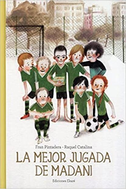 Luego, con el paso de los años, muchos de aquellos jóvenes talentos fueron evolucionando. Algunos llegaron a profesionales. La mayoría se quedó o escogió otros caminos. Todos, sin excepción, portaban ya en su día una mochila cargada con sus circunstancias personales: familiares, sociales, económicas o sentimentales. Unas veces esa mochila era más visible. Otras, ni tan siquiera se podía intuir. En La mejor jugada de Madani (Ekaré) Fran Pintadera -escritor y educador social- pone el texto y Raquel Catalina -ilustradora- las ilustraciones para ofrecer un relato ilustrado con la historia de un joven que lidera el equipo de fútbol de su barrio. Madani -así se llama- lleva el número 14 en la espalda y juega con los pies descalzos. La crónica asegura que “cada sábado, cuando el balón aterriza en sus pies desnudos, la plaza se detiene. No solo la plaza, ¡el mundo entero! Los camareros se quedan inmóviles con las bandejas en alto. Los ancianos dejan de discutir. Las palomas no vuelan. ¡Hasta el tráfico se paraliza!”. Es más, aseguran que, hasta la llegada del pequeño jugador, la estrella de los partidos era el que más fuerte le pegaba a la pelota. Luego, con sus regates y sus goles, los partidos de los sábados se seguían comentando durante toda la semana.