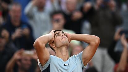 La liberación llega en forma de ace, a lo grande. En realidad, no podía ser de otra manera. No cuando se trata de Carlos Alcaraz, que persigue la bola como un guepardo, repele los zarpazos de Albert Ramos y a base de fe, corazón y una exacerbada convicción logra el punto (y el break) con el que consigue romper la camisa de fuerza después de 4h 34m de toma y daca. Al final, queda en pie él –citado este viernes con Sebastian Korda, el único que ha logrado rendirle esta temporada sobre polvo de ladrillo– y maldice el catalán, raquetazo al suelo y frustración. Lo ha hecho prácticamente todo bien, pero el alud se lo lleva por delante: 6-1, 6-7(7), 5-7, 7-6(2) y 6-4. Escapa el murciano, que ha pasado un mal rato de aúpa. Ha estado a un tris de salir del grande francés, pero prevaleció su luz, una dicotomía radical: tantos golpes ganadores (74) como errores.