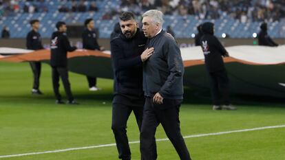 El Real Madrid alcanzó la final en la tanda de penaltis, pese a que la tarde anterior Carlo Ancelotti había contado que apenas preparaban esa suerte del juego: “Es imposible en un entrenamiento reemplazar el ambiente de una tanda de penaltis”, explicó, en referencia a la presión mental que ha provocado que en alguna ocasión no fuera capaz de encontrar cinco lanzadores dispuestos. Contra el Valencia tenía un plan sencillo: “La clave ha sido que he puesto a los tres de más experiencia, los tres más fríos. Primero Karim y Modric, que son los mejores. Asensio, que tiene muy buen golpeo. El último era Vinicius. Mejor que no tirara”, dijo riendo.