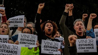 Antes de este episodio, el racismo contra Vinicius en España ya era noticia de primera página en su patria y objeto de indignación popular. En ese ambiente caldeado, la furia estalló tras el partido en Valencia por los insultos, claro, pero agravado porque Vinicius fue expulsado del campo cuando protestó y señaló a los racistas, y por la ristra de reproches que le dedicó a la víctima el presidente de LaLiga en su primera reacción, por la que Javier Tebas ha pedido disculpas. Circularon por redes memes que combinaban las capuchas del Ku Klux Klan con el logo de LaLiga, llamamientos al Banco de Santander para que dejara de patrocinarla y el martes, un centenar de activistas antirracistas se manifestaron ante el Consulado español en São Paulo.