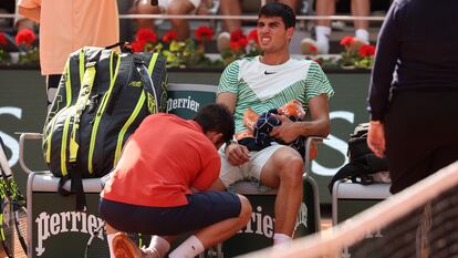 Alcaraz es atendido durante la semifinal contra Djokovic en la Chatrier.Foto: JULIAN FINNEY (GETTY) | Vídeo: EPV
