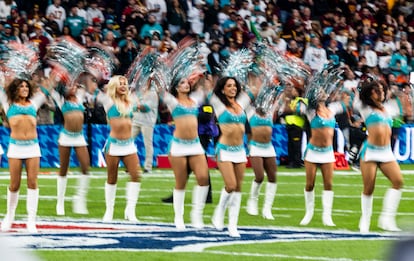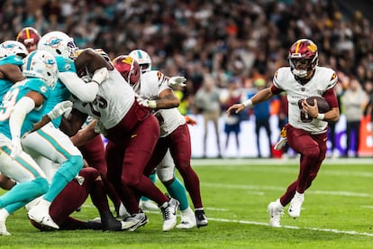 El juego, como era de esperar, era lo de menos en el Paseo de la Castellana. Lo novedoso recaía en todo lo que lo rodeaba, empezando por el torrente de estímulos que se agolpaba en los exteriores del estadio, donde las fotos, la música y la cerveza daban colorido a las interminables colas que conducían al férreo anillo de seguridad que blindaba el feudo del Real Madrid, mucho más restrictivo que en cualquier domingo liguero. Dentro, el imponente aspecto del Bernabéu, engalanado desde hace días para la ocasión, desencajaba la mandíbula a propios y extraños antes de dar paso al choque entre Dolphins y Commanders, la excusa deportiva con la que justificar el desembarco norteamericano en la capital.