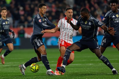 El Girona se ha dado cuenta de que debe presionar en bloque alto para evitar que el Real Madrid, muy cómodo cuando elabora, pueda seguir dominando. Continúa el empate sin goles.