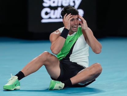 Carlos Alcaraz abraza el trofeo del Open de Australia.Darrian Traynor (Getty Images)Carlos Alcaraz sujeta el trofeo del Open de Australia tras su victoria ante Djokovic.Jaimi Joy (REUTERS)Alcaraz y Djokovic chocan las manos durante la entrega de trofeos.Tingshu Wang (REUTERS)Novak Djokovic levante el trofeo de finalista del Open de Australia. Dita Alangkara (AP)Alcaraz emocionado celebra la victoria ante Djokovic. Tingshu Wang (REUTERS)Alcaraz se tira al suelo tras ganar a Djokovic en la final del Open de Australia. Mark Baker (AP)Carlos Alcaraz celebra la victoria ante Djokovic. Asanka Brendon Ratnayake (AP)Carlos Alcaraz consuela a Novak Djokovic tras su victoria en el Open de Australia, este domingo.Asanka Brendon Ratnayake (AP)El tenista murciano celebra junto a su equipo la victoria en el Open de Australia. Aaron Favila (AP)Alcaraz celebra junto a su padre y parte de su equipo la victoria en el Open de Australia. Clive Brunskill (Getty Images)El tenista serbio lanza la pelota durante la final del Open de Australia ante Alcaraz. Dar Yasin (AP)Carlos Alcaraz celebra un punto ante Djokovic.Edgar Su (REUTERS)Carlos Alcaraz, durante la final ante Djokovic.Edgar Su (REUTERS)Djokovic, durante uno de los descansos. Dita Alangkara (AP)Un aficionado español sujeta un cartel con la imagen de Carlos Alcaraz.Kelly Defina (Getty Images)Alcaraz devuelve la bola a Djokovic. Quinn Rooney (Getty Images)Djokovic, durante la final. JOEL CARRETT (EFE)Seguidores de Alcaraz animan al tenista español. Tingshu Wang (REUTERS)El tenista español consigue devolver la bola a Djokovic. Phil Walter (Getty Images)Alcaraz reacciona junto a su equipo durante la final masculina ante el serbio Djokovic.Tingshu Wang (REUTERS)Alcaraz, durante un saque en la final del Open de Australia.Tingshu Wang (REUTERS)Novak Djokovic, durante la final.Associated Press/LaPresse (APS)Alcaraz devuelve la bola a Djokovic. Clive Brunskill (Getty Images)Djokovic reacciona tras un punto ante Alcaraz.Edgar Su (REUTERS)Djokovic y Alcaraz, en la final del Open de Australia en Melbourne Park.Lintao Zhang (Getty Images)Carlos Alcaraz devuelve un revés durante la final del Open de Australia ante Novak Djokovic, este domingo en Melbourne Park.Phil Walter (Getty Images)Djokovic consigue golpear la bola ante Alcaraz.Edgar Su (REUTERS)Carlos Alcaraz y Novak Djokovic posan con el trofeo de la final masculina antes del partido.