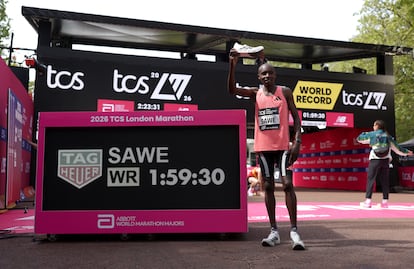 Sabastian Sawe creía que los de Adidas estaban de cachondeo. Pesaba tan poco la caja con las zapatillas que iba a estrenar en Londres que pensaba que se la daban vacía. Menos de 100 gramos la unidad. Placa de carbono intuida. Espuma como aire. Solo un maratoniano voló con calzado más ligero, Abebe Bikila, el etíope de pies descalzos que en 1960 ganó el oro olímpico botando, callos sobre piedras, sobre los sanpietrini de Roma y dejó el récord del mundo en 2h 15m 16s. Entonces, en la edad de las leyendas, los límites del rendimiento los fijaba el talento, la capacidad de sufrimiento, cabezas duras como de mula. El factor humano que fascinaba, y dejaba con la boca abierta a los que leían la historia de la vida de los héroes capaces de correr tanto tiempo y tan deprisa, anacoretas chupados, fibra y mucho corazón.