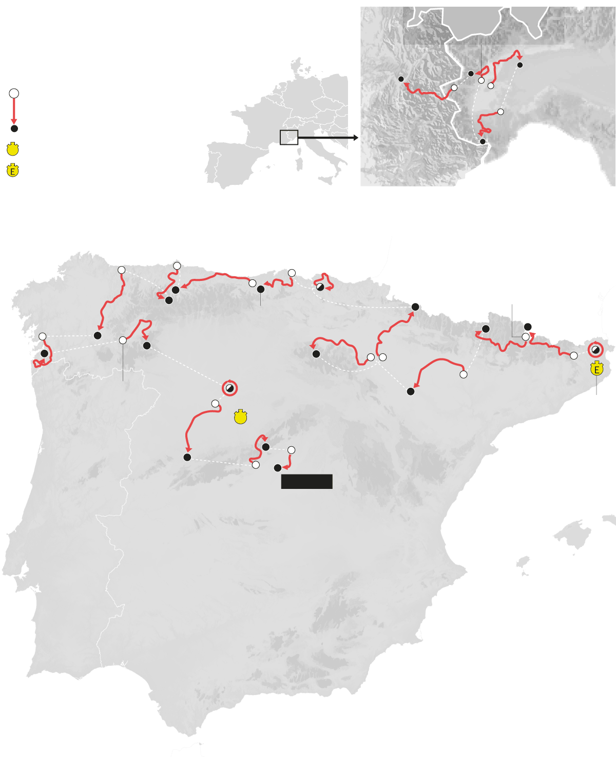 La 80ª edición de la Vuelta (hay que descontar de los 90 los años de la guerra y las intermitencias de los primeros años del franquismo) partirá el 23 de agosto desde las afueras de Turín, en Italia, y terminará en Madrid el 14 de agosto. Serán 3.138 kilómetros (150 por etapa, cortitas), 46 de ellos contrarreloj (20 en Figueras el quinto día, por equipos; 26 en Valladolid, individual como en 2023, Pippo Ganna, la 18ª etapa), mucha montaña, como es habitual, y ocho finales en alto en puertos de primera o de categoría especial: los clásicos Pal, en Andorra (sexta), Cerler (séptima), Valdezcaray (novena), Belagua (10ª), y los más radicales asturianos de Angliru (13ª) y Farrapona, donde los osos de Somiedo (14ª), Morredero, en Ponferrada, (17ª), y Bola del Mundo (20ª).