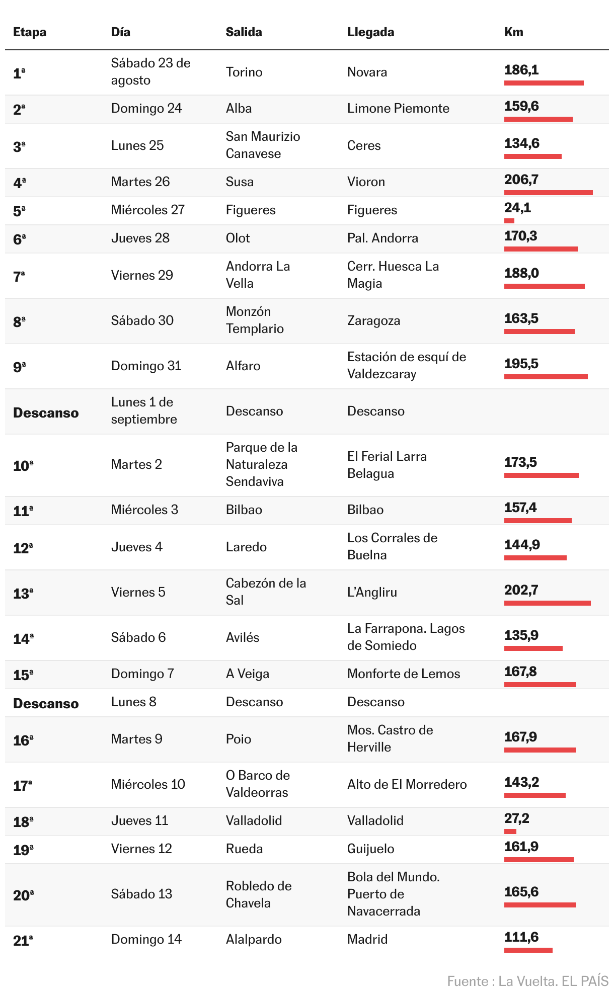 Destacan cuatro etapas sobre el resto, de esas en las que las montañas se echan encima con carreteras reviradas y esfuerzo titánico de los ciclistas. Etapa 7, entre Andorra la Vella y Cerler, final en alto en once ocasiones y rompepiernas como pocos. En la 14, ya en la cordillera cantábrica, con la subida a La Farrapona, kilometrada cuesta arriba. Y en la 20, como ya ocurriera en 2010 y 2012, se hollarán 2.351 metros de altitud camino de la Bola del Mundo, puerto de Navacerrada. Por entonces, ya se sabrá el ganador. Aunque queda otra etapa que puede ser la mejor de las cribas, la 13, desde Cabezón de la Sal hasta el Angliru. Ese puerto en el que en 2020 Vingegaard aupó a Roglic para que se llevara el triunfo final. Esa misma ascensión, ya en 2023, en la que el danés, que había pasado de gregario a líder, debió frenar para que la gloria fuese para su compañero Kuss.