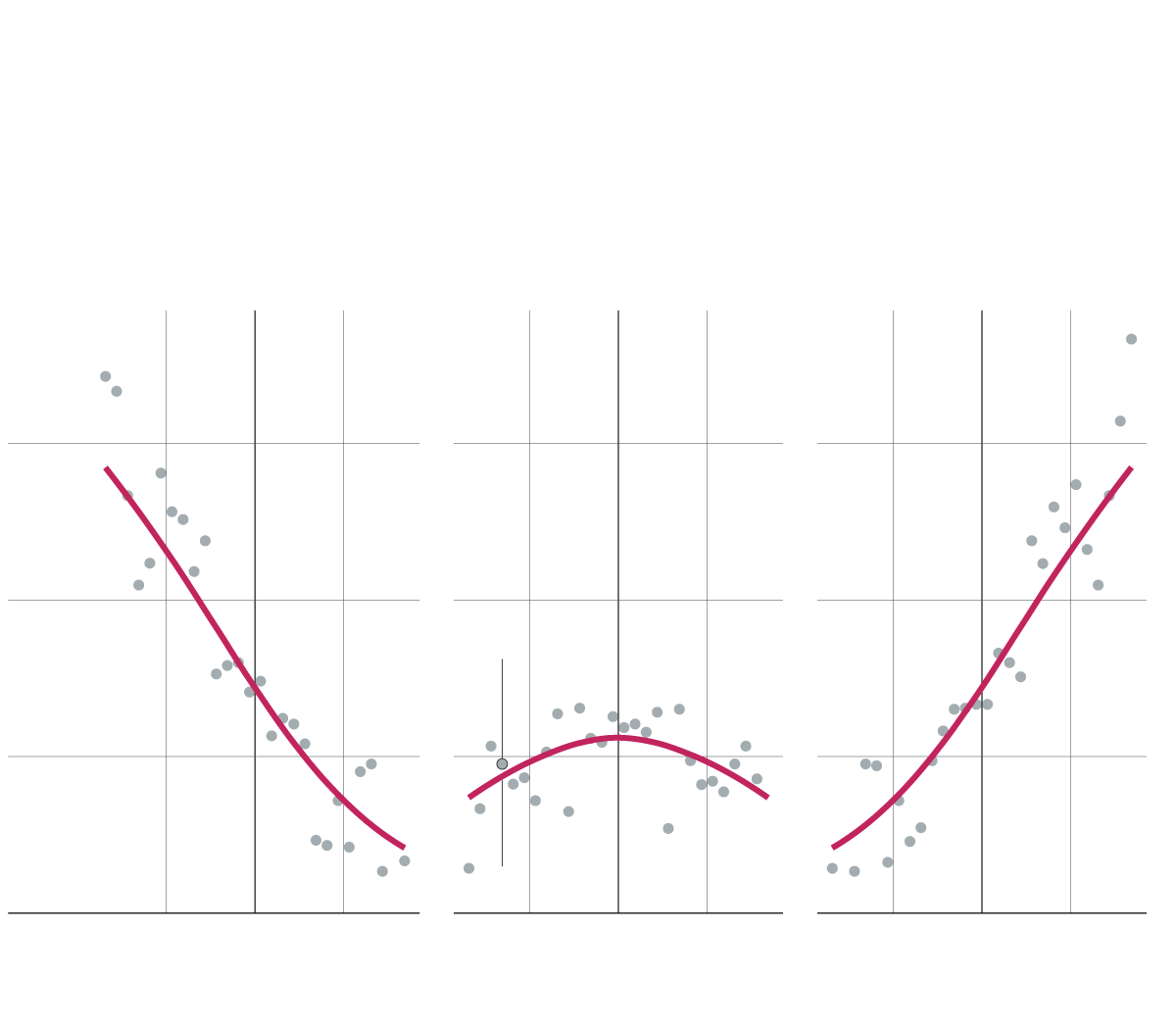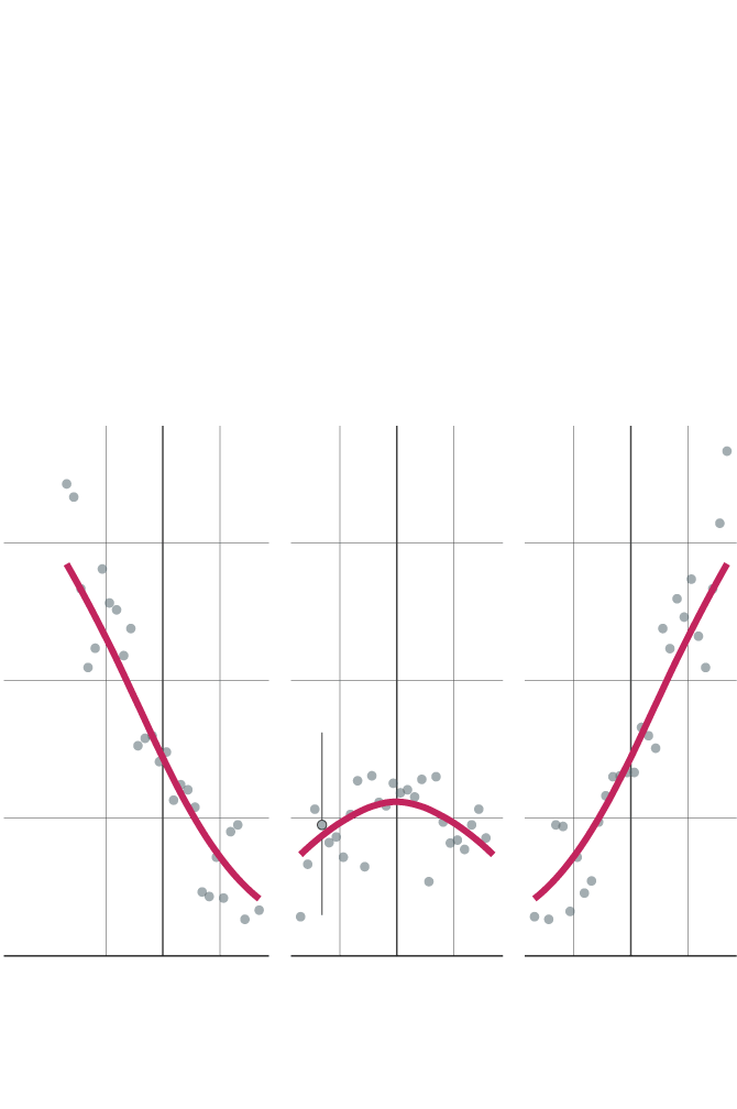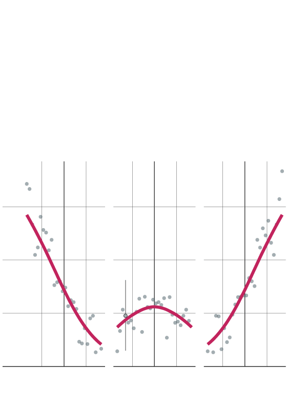 Entrenamiento del modelo. Los puntos representan los resultados de partidos reales y las líneas las predicciones del modelo. Para partidos entre equipos con cierta diferencia de ranking Elo (eje x), se muestra la probabilidad o el porcentaje que acaban en derrota, empate o victoria (eje y).