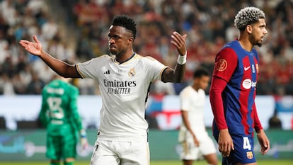 Cumplido el protocolo, se marchó con paso parsimonioso por donde había venido. A las 22.07 hora saudí, exactamente desde su lugar de visualización, mandó un pase exquisito a Vinicius, entre Christensen y De Jong, y sin que Koundé pudiera cortarlo. Un envío que inauguró el triplete del brasileño, tantas veces capado en los clásicos por Araujo y esta vez liberado gracias al espacio que le concedió la defensa azulgrana, muy adelantada, y la noche negra del uruguayo, expulsado. El extremo celebró el primer tanto con el siu de Cristiano Ronaldo, presente en uno de los palcos. “El Barcelona da muchos espacios a la espalda, vimos vídeos y el míster nos avisó de eso”, explicó Vinicius.
